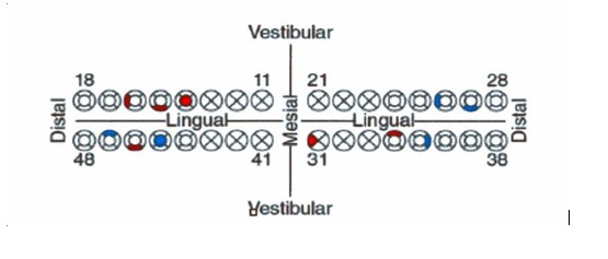 Anota correctamente en un odontograma (caries en rojo y obturaciones en azul) los siguientes datos: